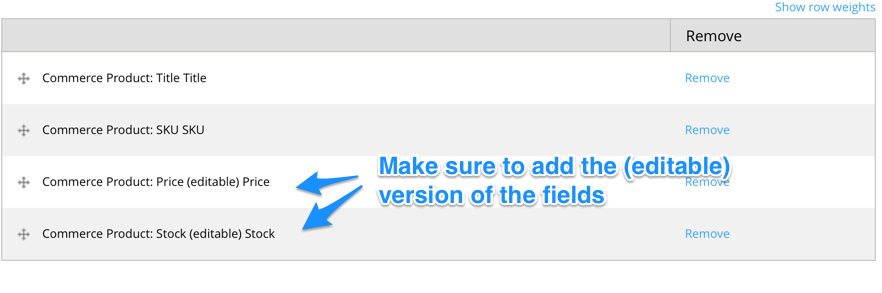 Now, you're going to want to add Title and SKU fields. Nothing special here. Once you do that, find the editable "Price (editable)" and (if you have Commerce Stock enabled) the "Stock (editable)" fields to your view as well. You'll need to add labels to them so that they show up in the table header. Once you've added those, rearrange accordingly.
