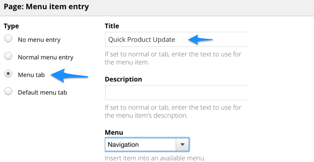 Now, go ahead and add the menu tab so that your view will show up as a tab on the Manage Products page.