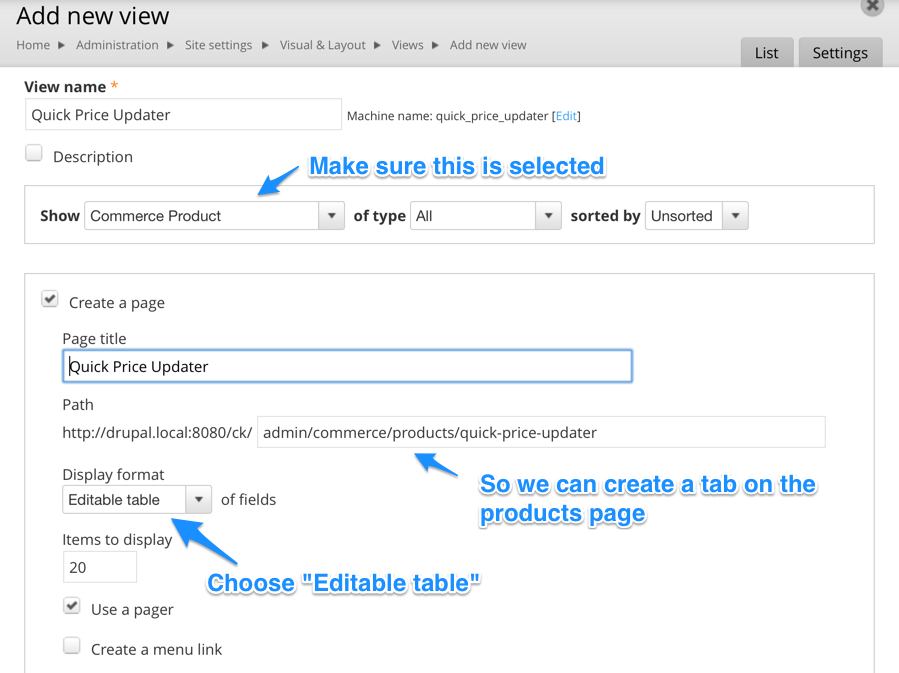 First, you will need to download the Editable Views module and enable it. We won't cover that here, but Drupal.org has a page on installing Drupal 7 modules that can walk you through the process. Once you do that, you will want to create a new view and set it up for our quick price updater page: